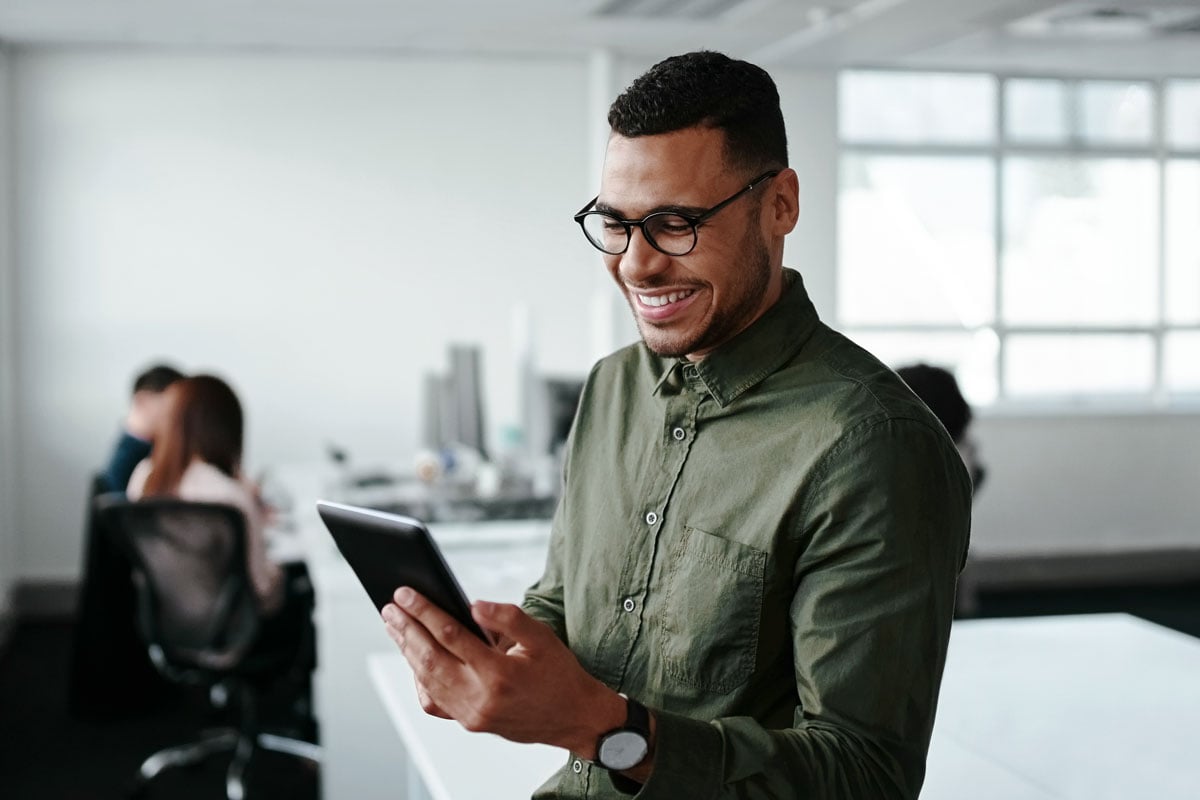 A business man smiles as he looks at his iPad.