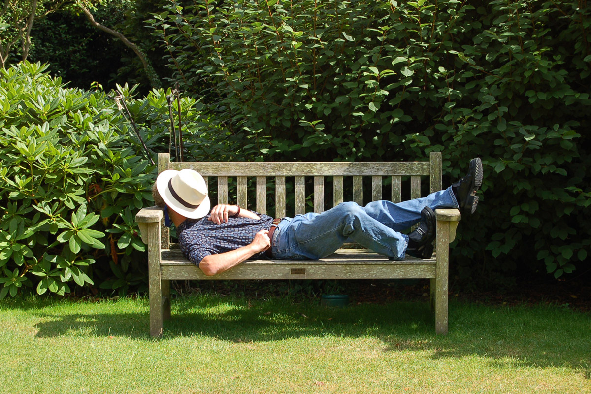 A man sleeps on a bench with a fedora over his head.