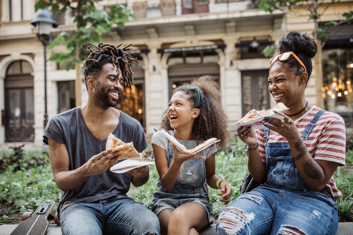 A father, daughter and mother eat pizza.