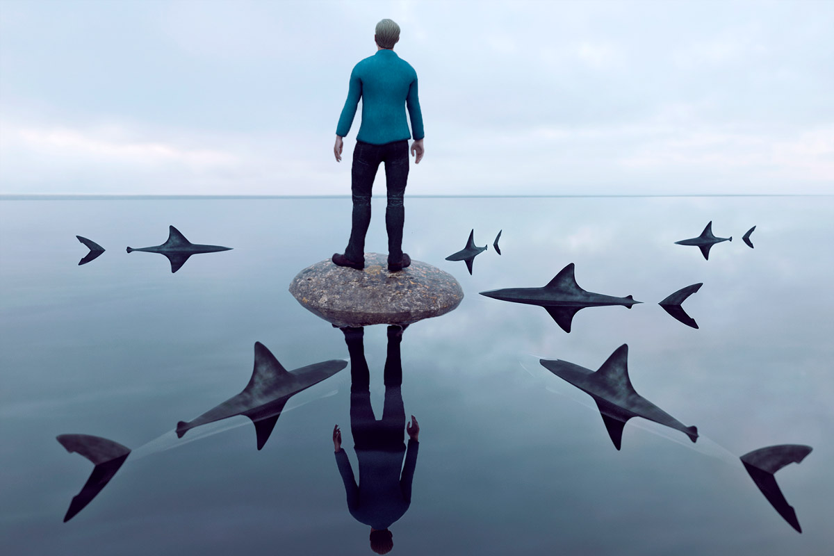 A man stands on a stone as sharks surround him in the open water.