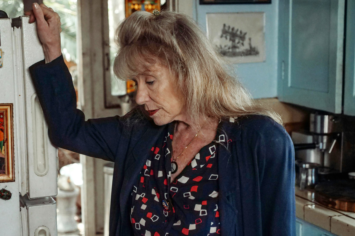 An elderly woman leans against a freezer in her kitchen.