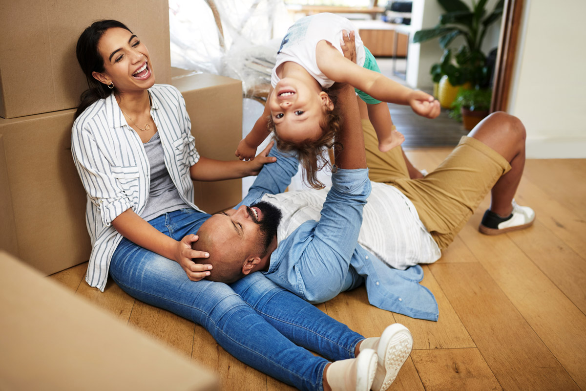 A family sit on a floor with moving boxes all around them. They are celebrating moving into their new home.