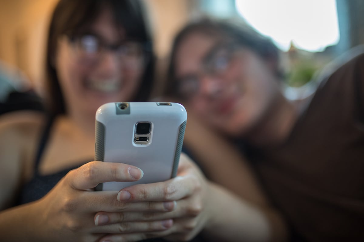 Two people looking at a phone