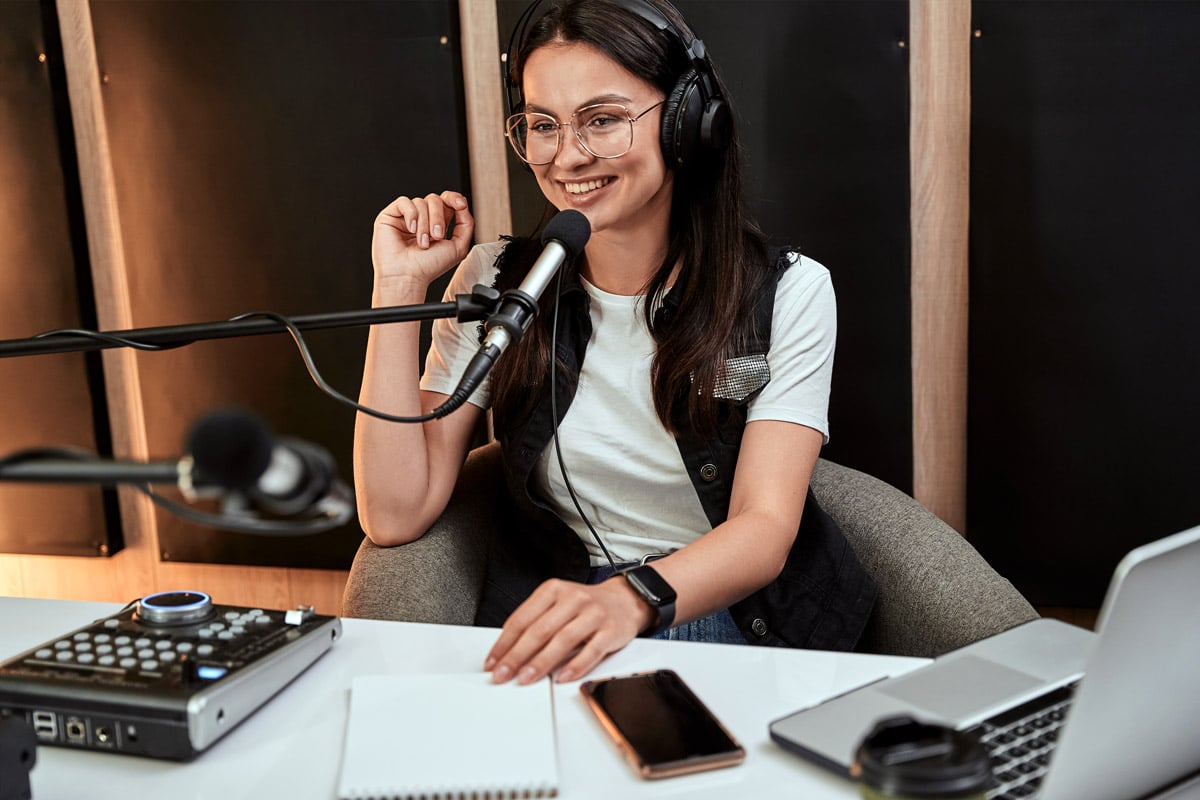 A woman uses her home studio to do some voice acting work.