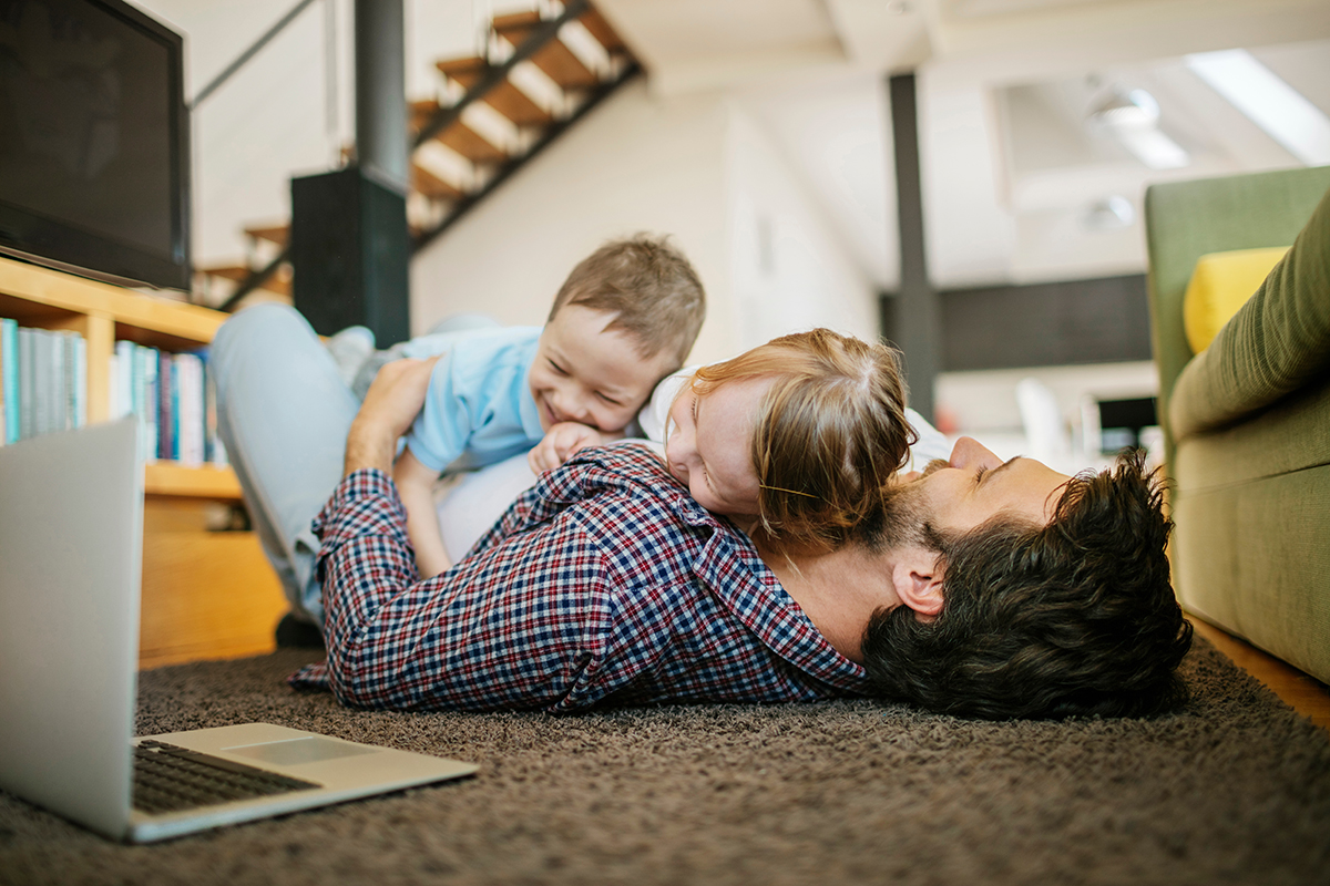 A father takes a break from his work to play with his kids.