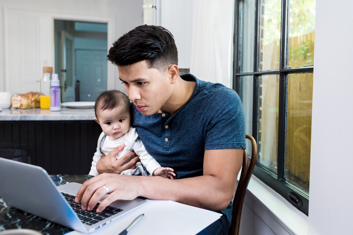 A man works on a laptop while holding his baby.